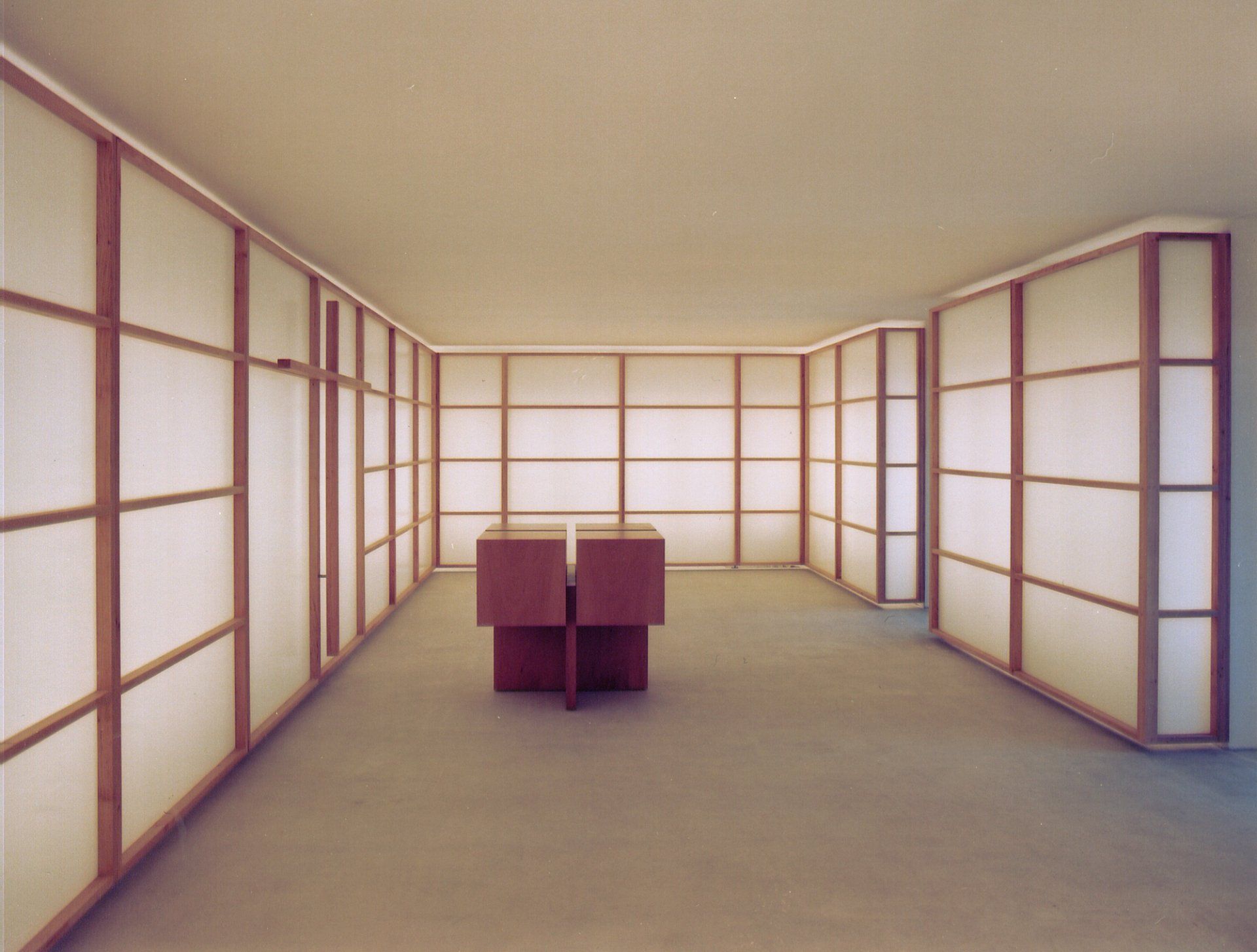 Materials: wooden structure (alder), screen-printed glass, daylight tubes; Floor: white pigmented, seamlessly poured anhydride screed; Altar: pear wood