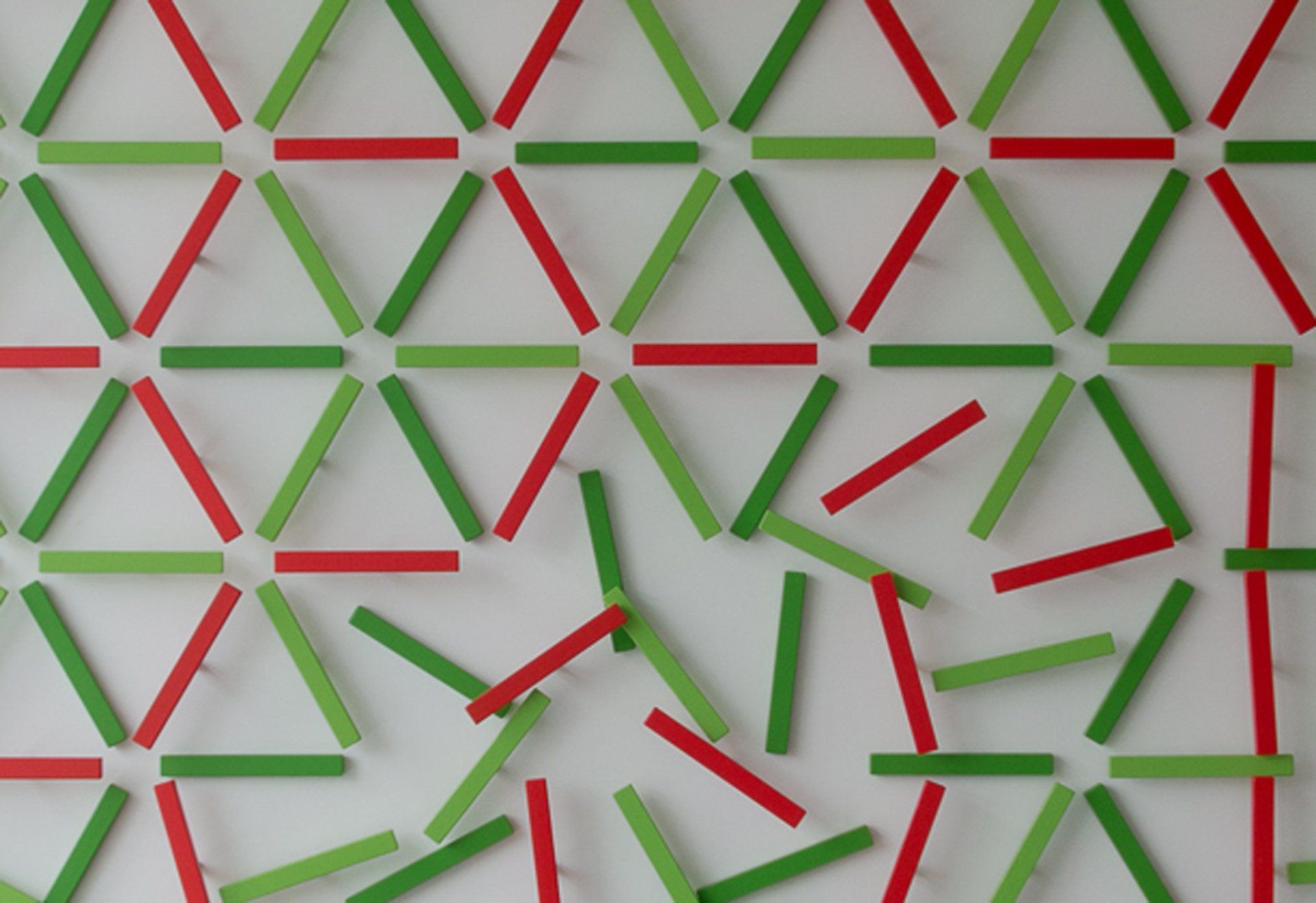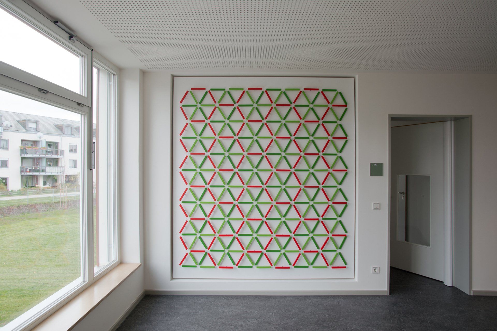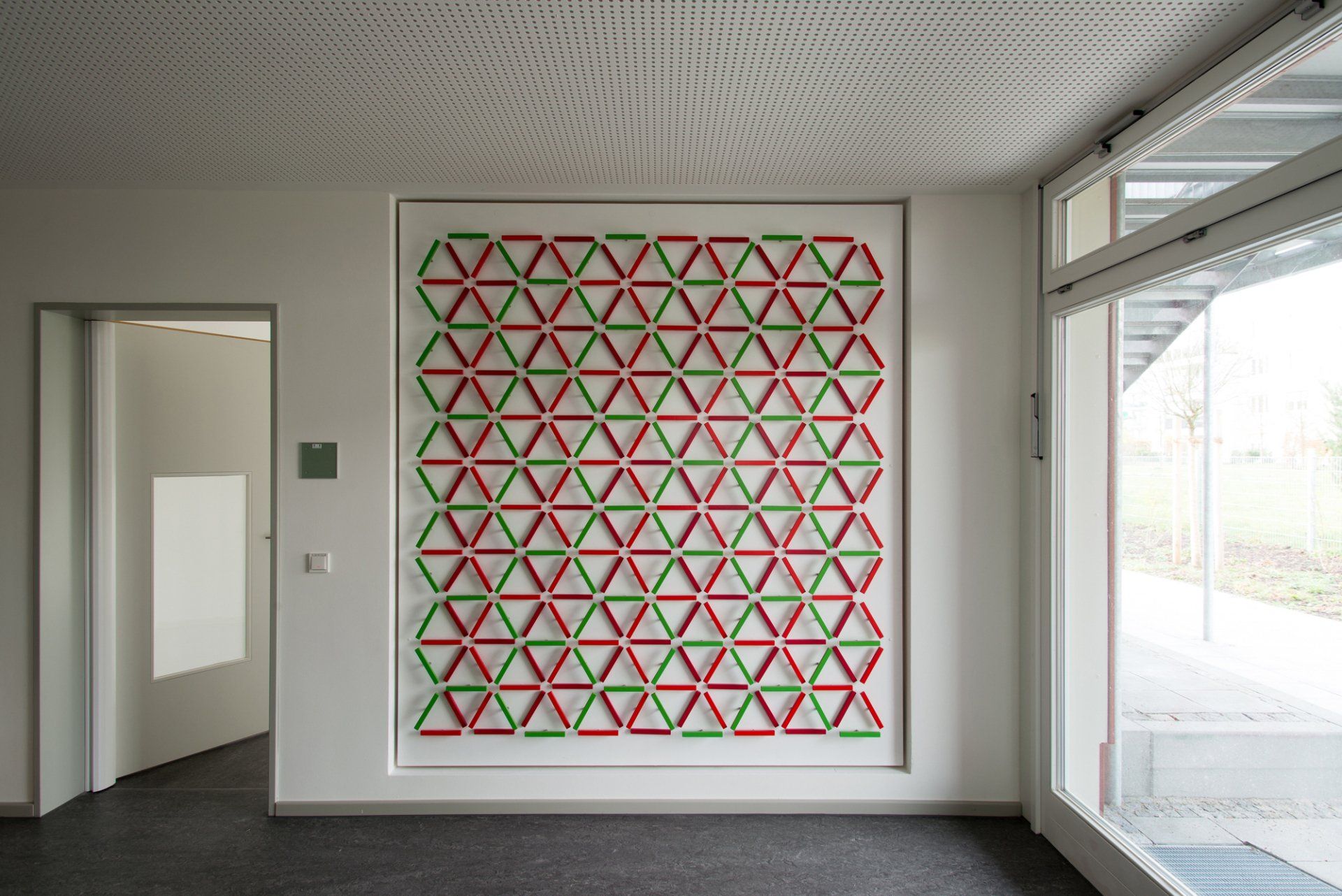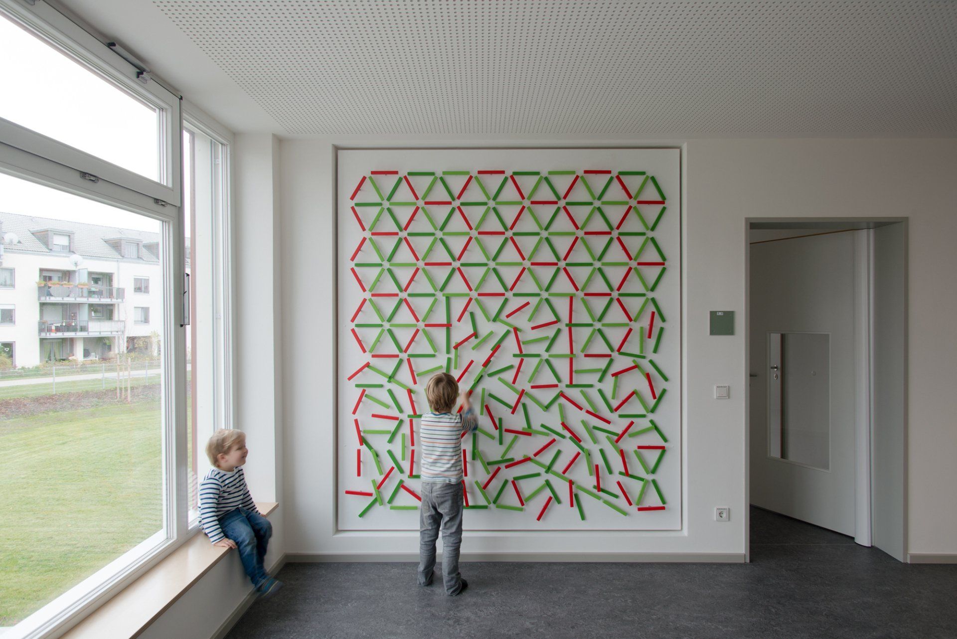 In the two wall niches in the play hall of the day-care center, two movable ornaments were placed in the color sequence of green, green, red on the upper floor and red, red, green on the ground floor. They are composed of rotating wooden blocks that are reminiscent of building and play blocks. By turning the individual elements, the ornament changes beyond recognition, but only up to the height to which the children can climb. The result is the image of an architecture whose statics dissolve towards the bottom and which makes the children's influence visible on a daily basis.