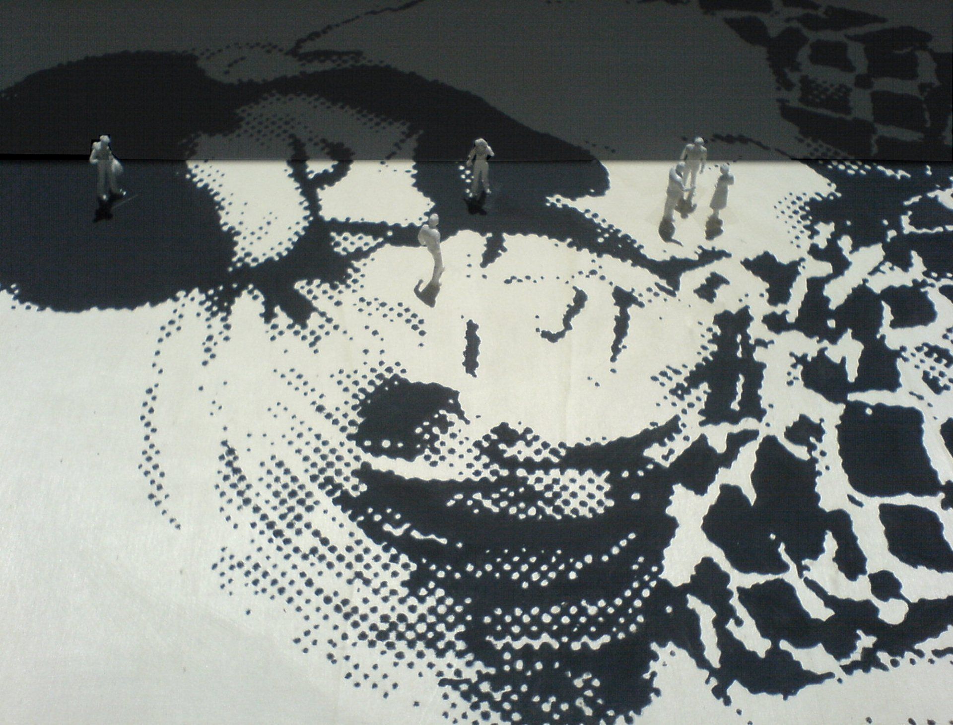 Umgeben von Gebäuden, liegt ein Bild wie ein Teppich in der Mitte der Fläche. Beim Beschreiten des Platzes ergibt sich für den Betrachter ein wechselndes Spiel von Punkten, Flecken, Inseln und Kontinenten, die dem Fußgänger eine Relation zur Weite des Platzes vermitteln. Die Abbildung zeigt ein Motiv aus dem Film „Angst essen Seele auf“, einem der bekanntesten Filme Fassbinders. Das Motiv zeigt ein auf mehreren Ebenen gegensätzliches Paar: in der Hautfarbe, im Alter, im Geschlecht, in der Kultur. Die Wahl des Motives für diesen Platz steht für den Wunsch nach Überwindung dieser Gegensätze im Zusammenleben der Menschen im Viertel. Das Motiv entspricht aber auch dem Klischee eines Kinoplakates. Man erkennt, dass dieses Bild konstruiert ist und eindeutig der Welt des Filmes zuzuordnen ist. Dieses entspricht der Auffassung Fassbinders über die Beziehung zwischen Kunst und Leben: „Der Film ist wie ein Rechteck Leben. Hier wie da gibt es Grenzen. Aber ich glaube der Film ist ehrlicher, denn er gibt zu, dass er begrenzter Raum ist.“ Zitat: Rainer Werner Fassbinder