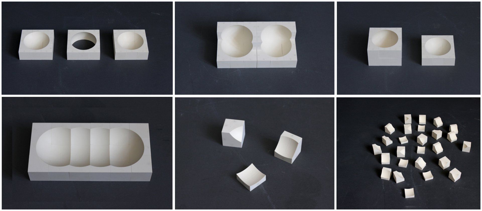 Durch Verfahren wie Schneiden, Teilen, Aneinanderreihen und Neumontieren, öffne ich die Geschlossenheit der Kreis- und Kugelform. Durch Eingriffe in die Geometrie verändert sich augenblicklich das Verhalten und der Bezug der Kugel zum Raum.