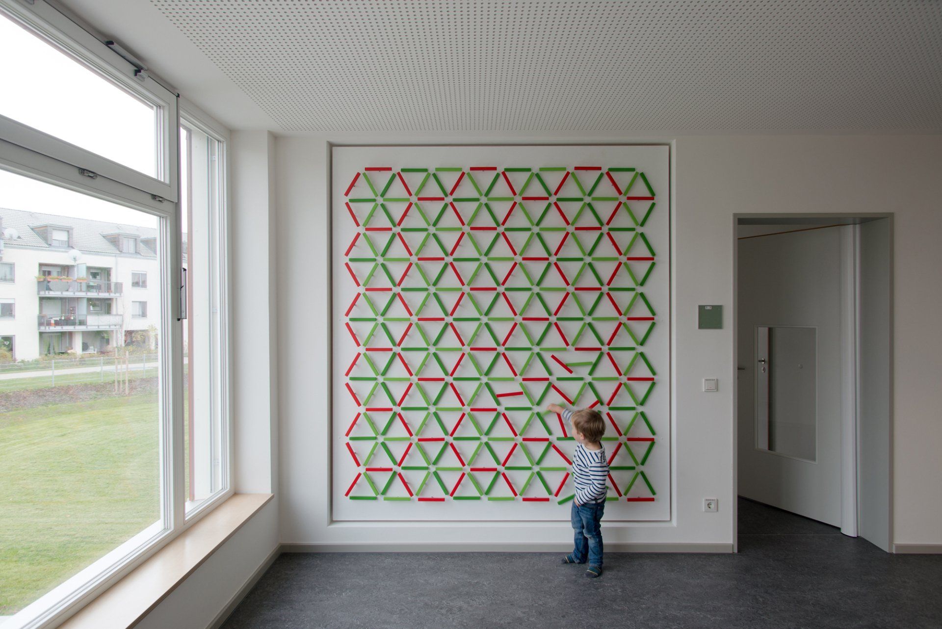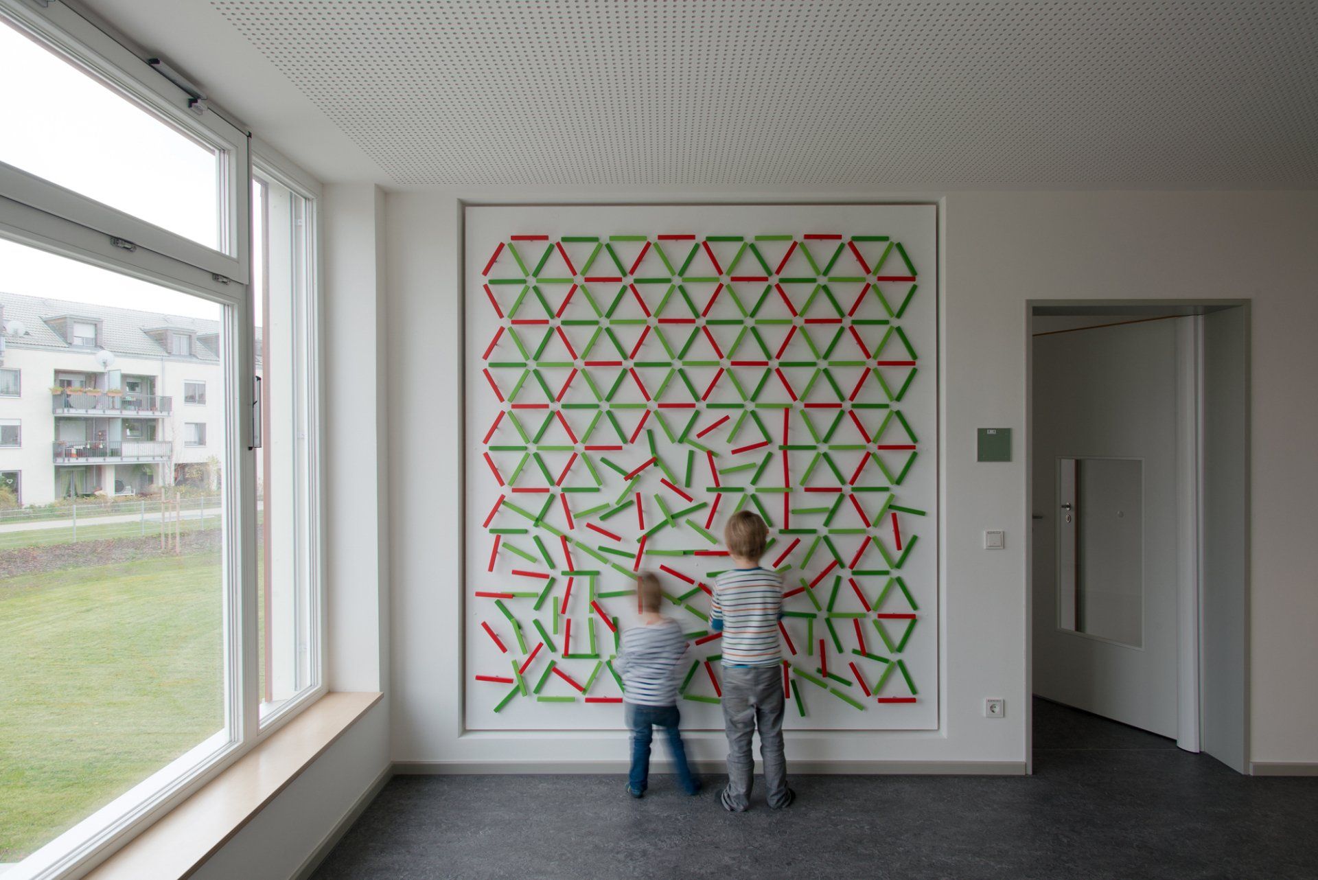 In die beiden Wandnischen im Spielflur der Kindertagesstätte wurden zwei bewegliche Ornamente in der farbigen Abfolge von Grün, Grün, Rot im Obergeschoss und Rot, Rot, Grün im Erdgeschoss gesetzt. Sie sind aus drehbaren Holzklötzchen zusammengesetzt, die an Bau-und Spielklötze erinnern. Durch das Drehen der Einzelelemente verändert sich das Ornament bis zur Unkenntlichkeit, allerdings nur bis zu der Höhe zu der die Kinder hinaufgelangen. Es ergibt sich das Bild einer Architektur, deren Statik sich nach unten hin auflöst, und die den Einfluss der Kinder täglich sichtbar macht.